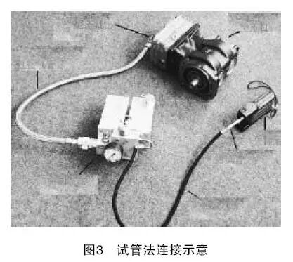 試管測試方法可以直接在發動機總成或直接是汽車上對空壓機進行測試,也可以單獨對機頭進行測試,是一種非常方便的測試方式。試管測試方法是通過采樣泵,采集空壓機打出的氣體,由于壓縮氣體中含有機油、水等污染物,而試管中含有相關的化學反應物質,所以通過化學反應實現對空壓機竄油的測試。在測試之前首先檢查測試設備裝置是否含有油污,如果含有油污應經過清洗之后再進行測試,若沒有清洗將影響測試結果。