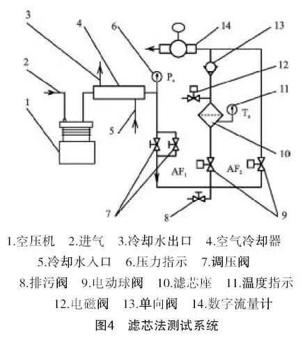 濾芯測試法也是重量法的一種,但其測試精度較濾紙重量法卻要高出許多。我院為某企業成功研制的一套濾芯法測試系統如圖4所示,壓縮空氣會完全通過一個裝有濾芯的過濾容器,即濾芯座(10),且內部濾芯對油氣的過濾精度達到